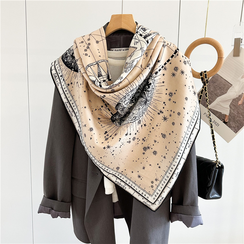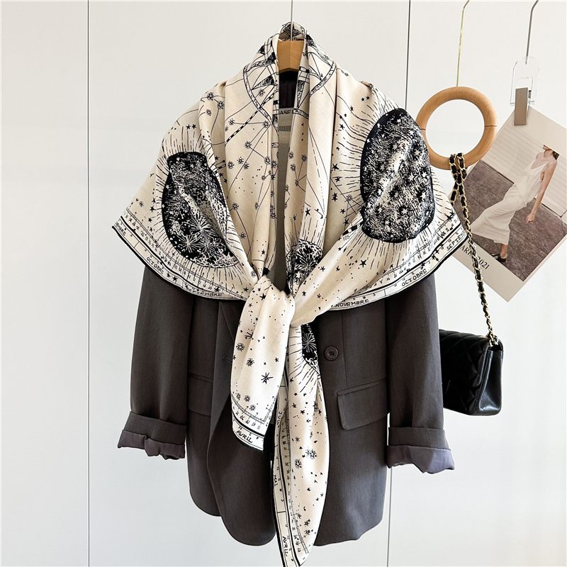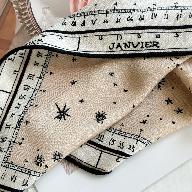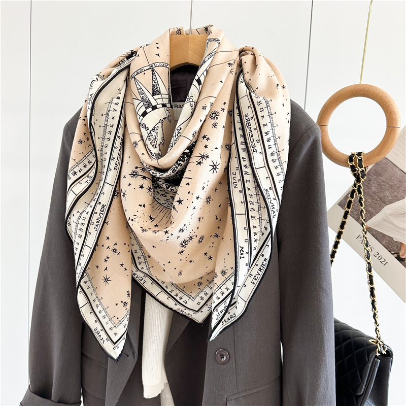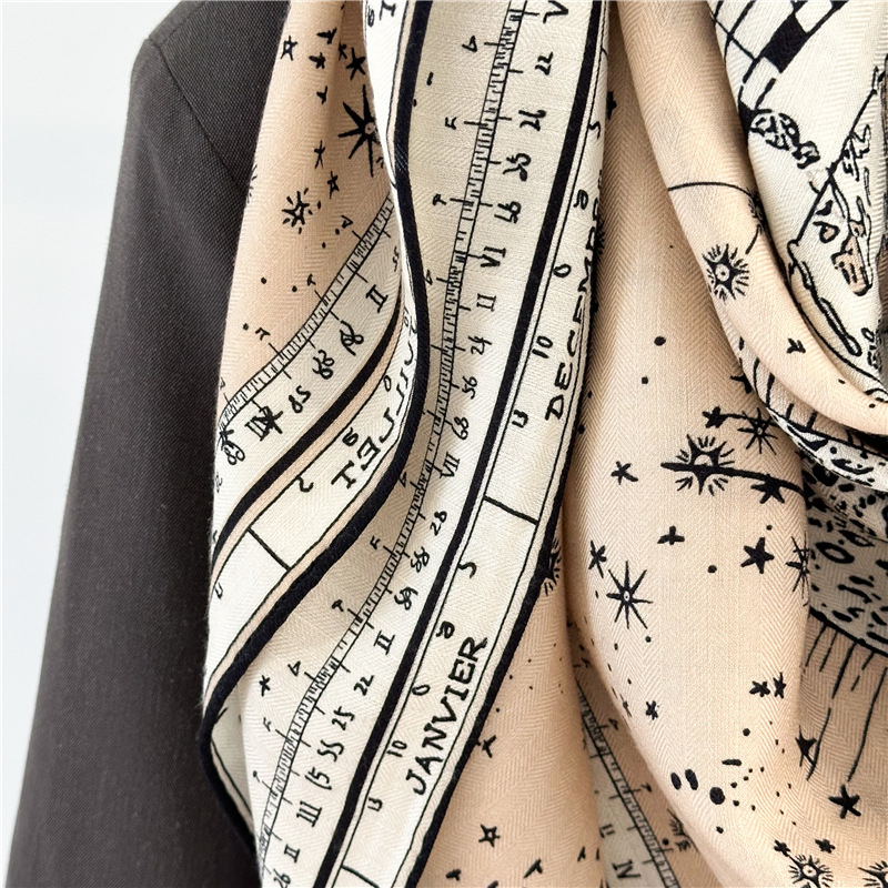 This D Brand Design Horoscope Travel Luxury Silk Wool Shawl is our popular design. Sold very well. It is double side print with luxury design. Fashion Women like it very much.
